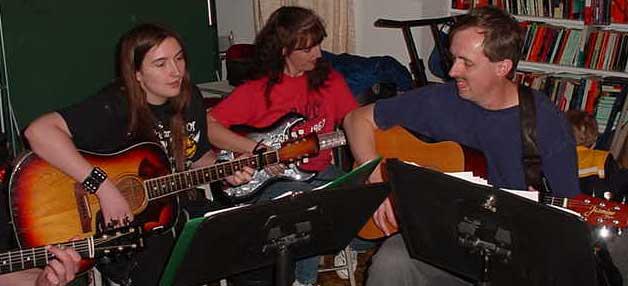 | Rachel, Karen, Jeff at Darell's 04 "Did someone step on a cat?" | |